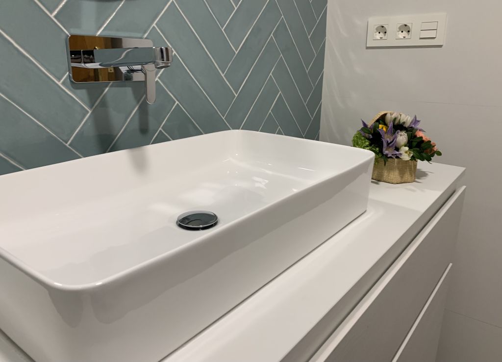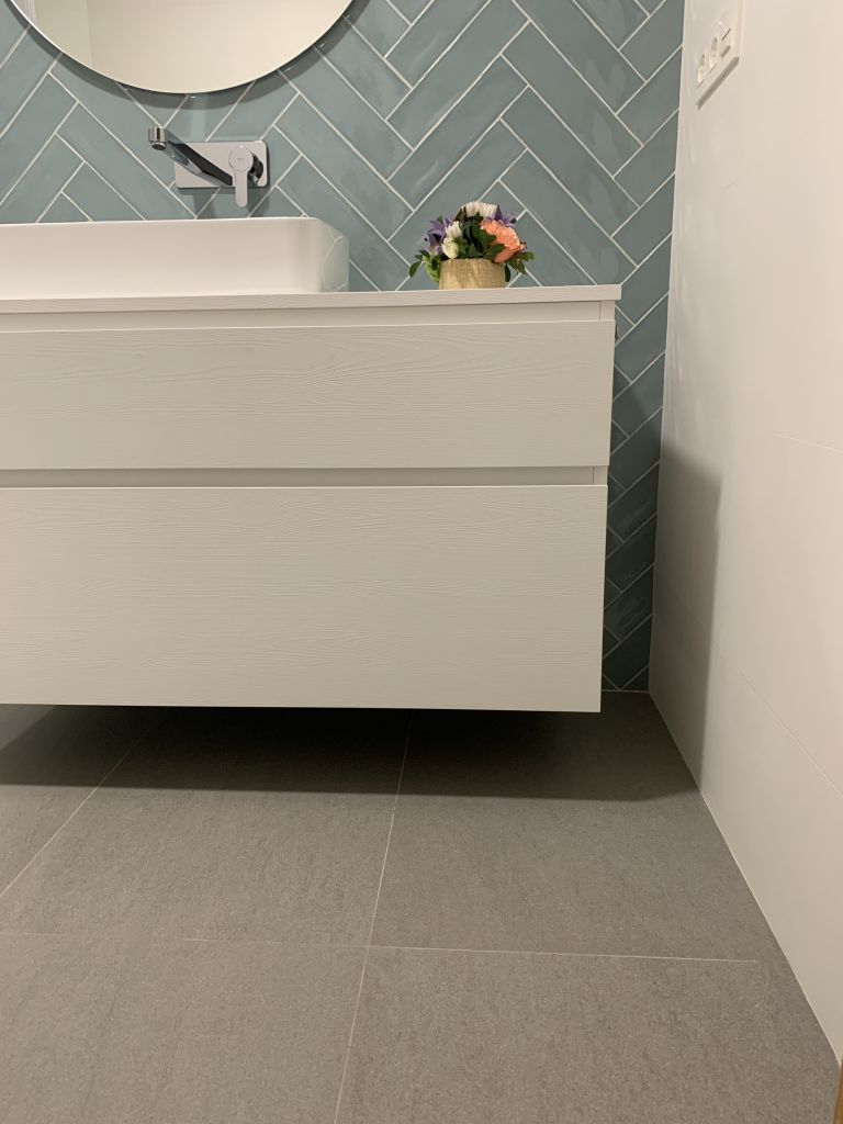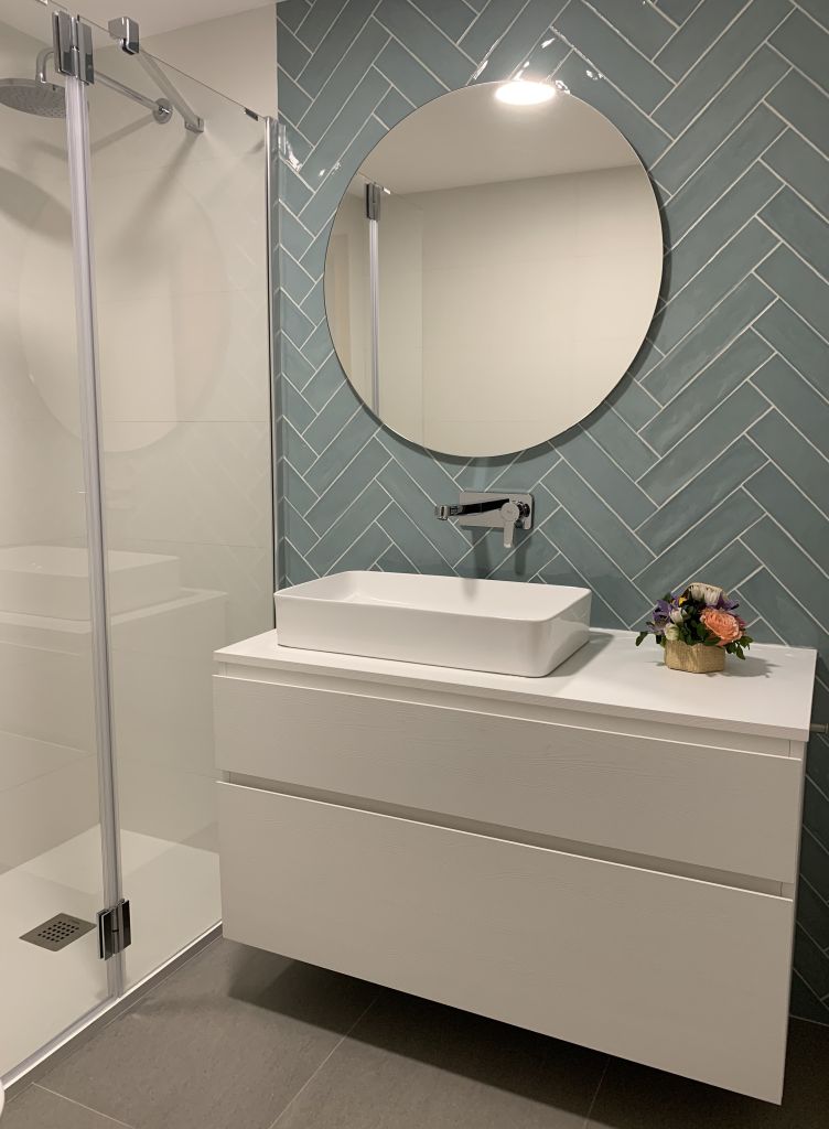 La peculiaridad de esta reforma ha sido la disposición de las baldosas con dibujo geométrico enmarcándolas en piezas lisas, haciendo como una alfombra, con un diseño original consiguiendo que el suelo no quede muy recargado.