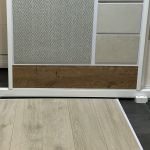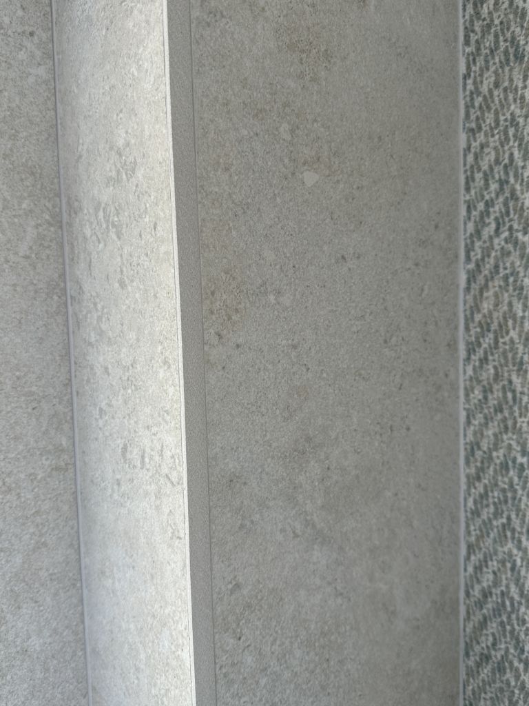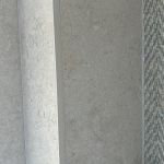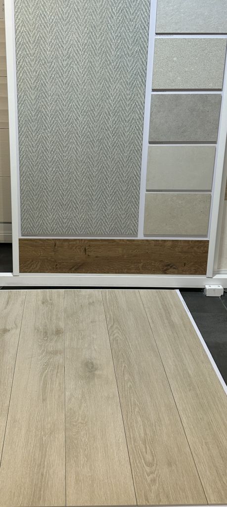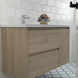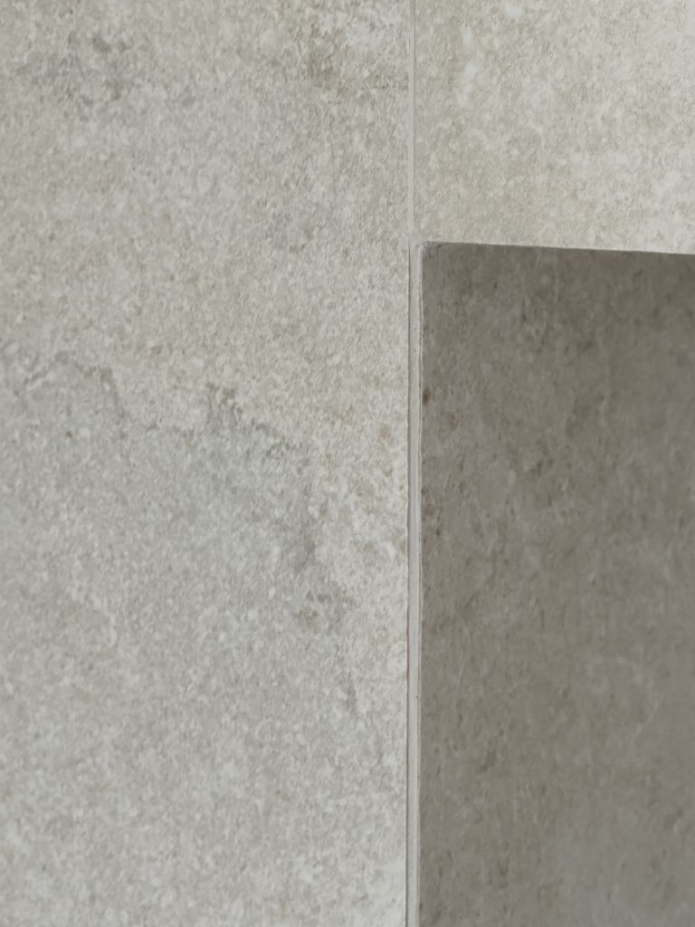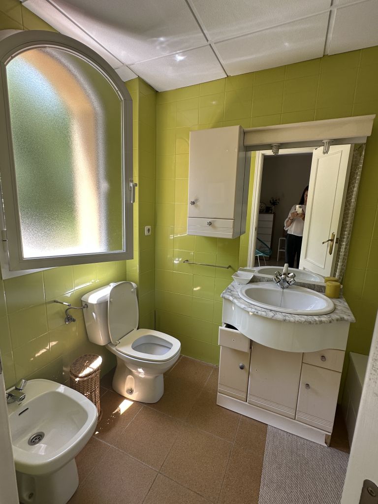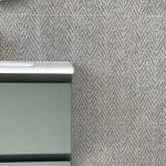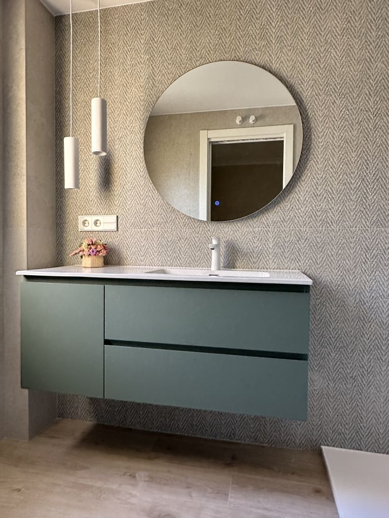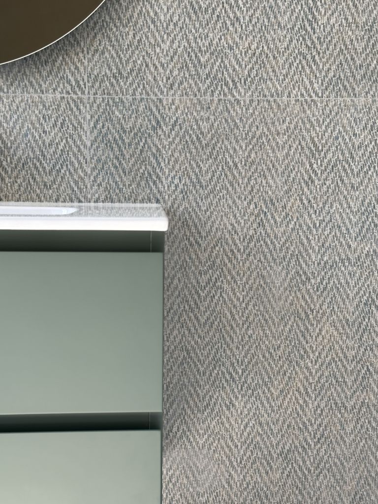 En el caso del baño principal, destacar nuestro material favorito: un revestimiento porcelánico de gran formato, colocado en vertical y con dibujo de espigas ¡parece papel pintado!!
